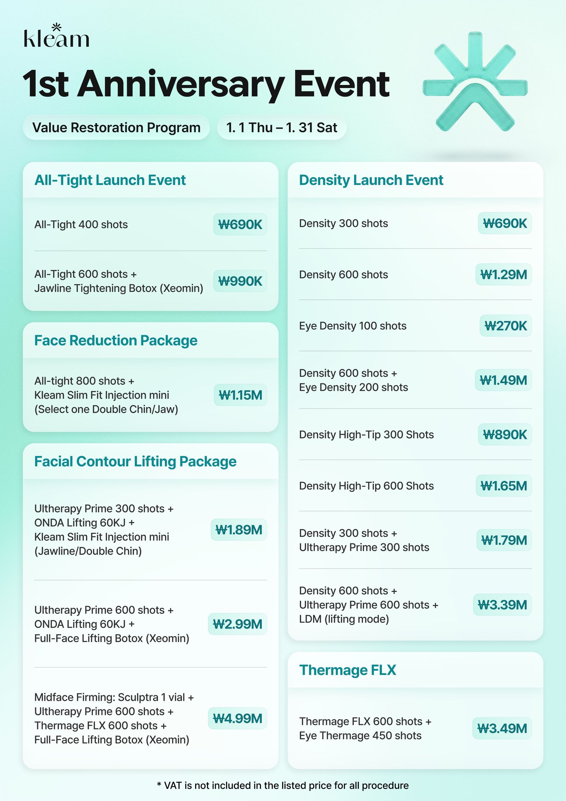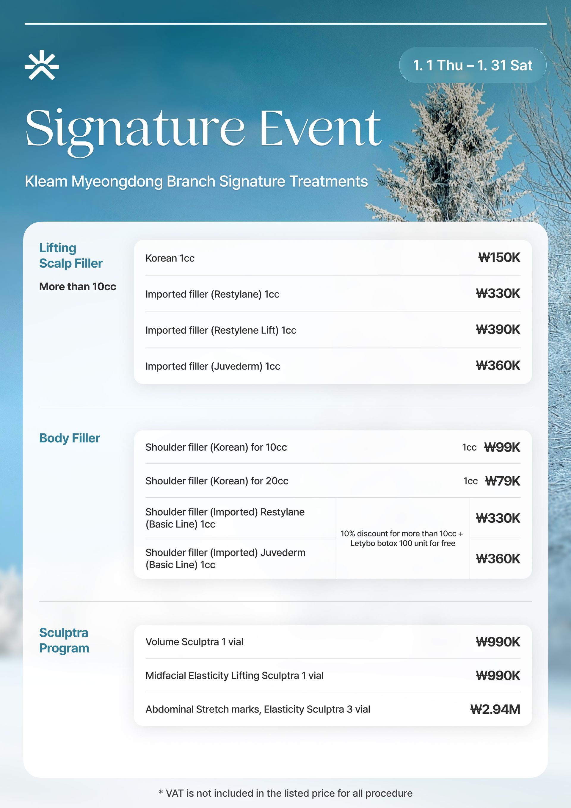 Skinvive, Radiesse, Waterglow Injection, Rejuran Healer, Q-Facial, LDM, Waterdrop Lifting Peel, Mall DM.Cell, Skin Plus Ampoule, Exosome (G-MPF), Lilied M, Juvelook, Chanel Injection, Aqua Shine BTX, Vital Injector 2, Dermashine Balance, Skinbooster Pro, Shining Peel, Oxygen Dome Facial, LED Light Therapy, Calming Care Facial, Hydration Infusion Therapy, Brightening Facial, Sebum Control Facial, Pore Tightening Booster, Moisture Glow Shot, Glutathione IV, Vitamin C Drip, Anti-aging Cocktail Drip, MTS + Ampoule Facial, Gua Sha Facial, High-Frequency Facial, Acne Peel, Enzyme Peel, Milk Peel, Mandeli Clear Peel, Salmon DNA Booster, PolyNucleotide Therapy, 5GF Ampoule Therapy
