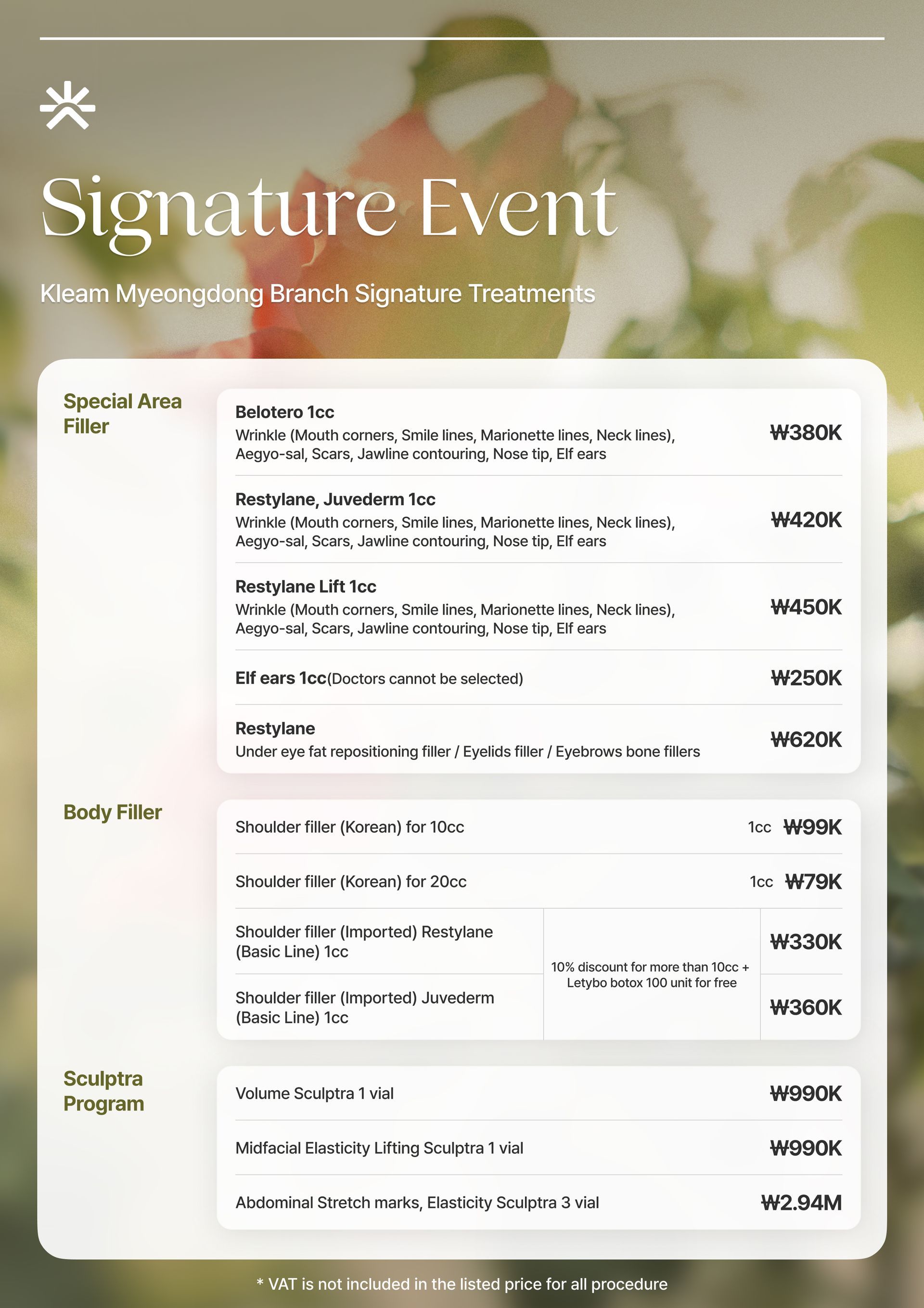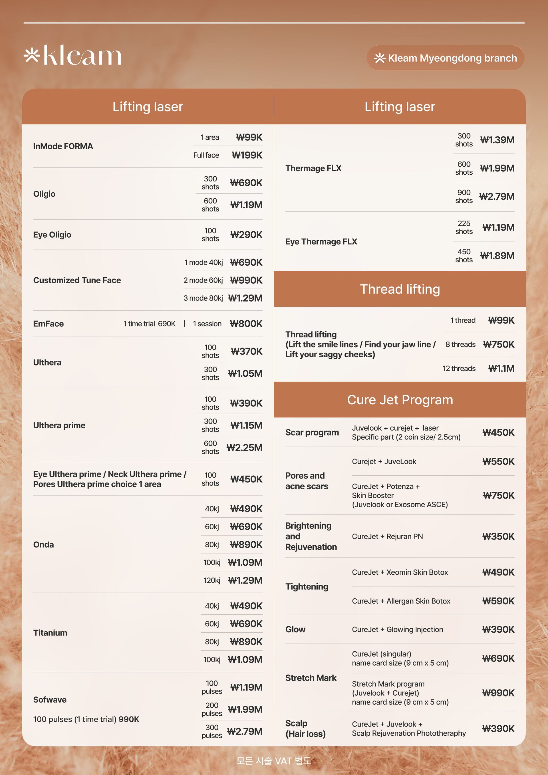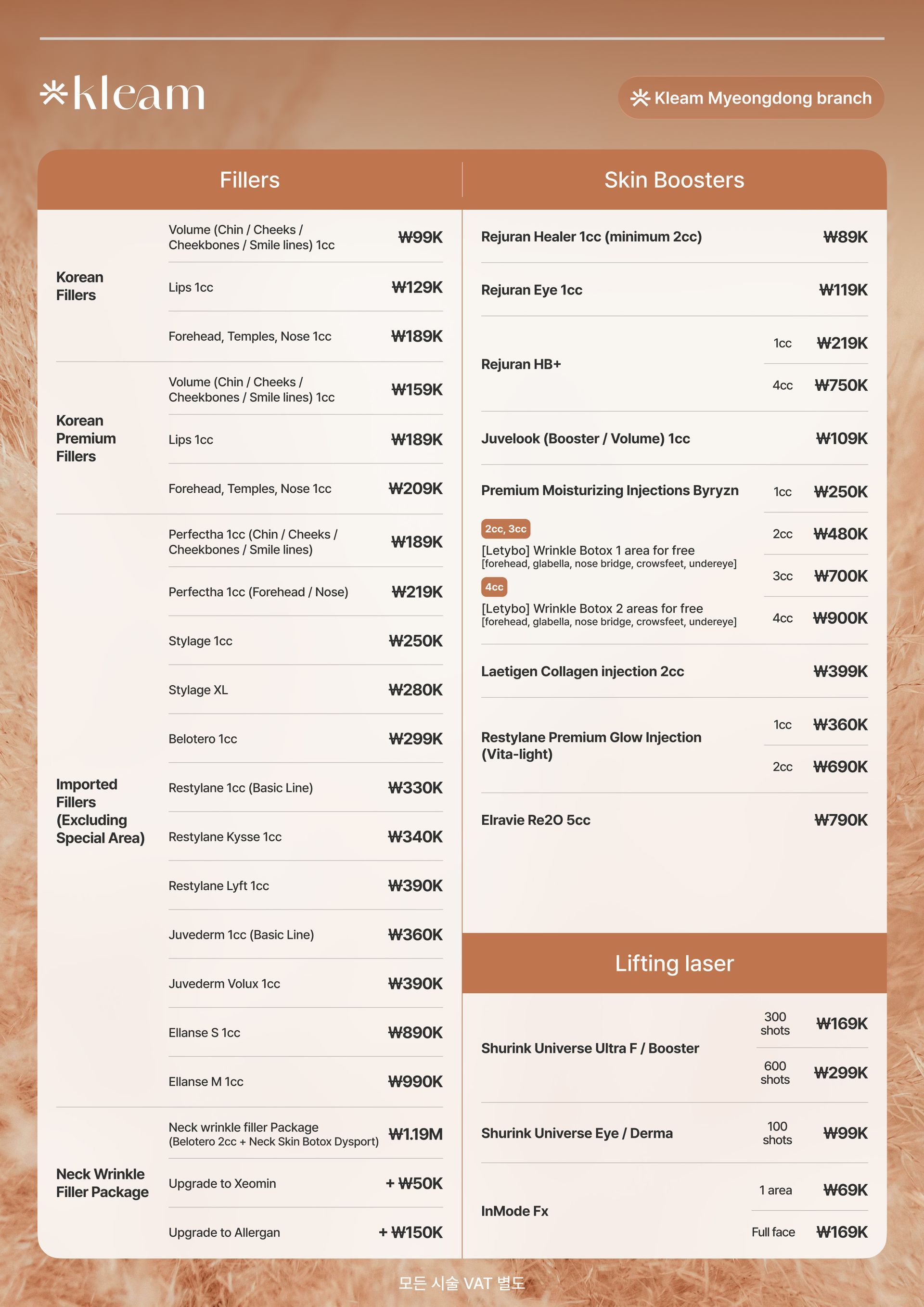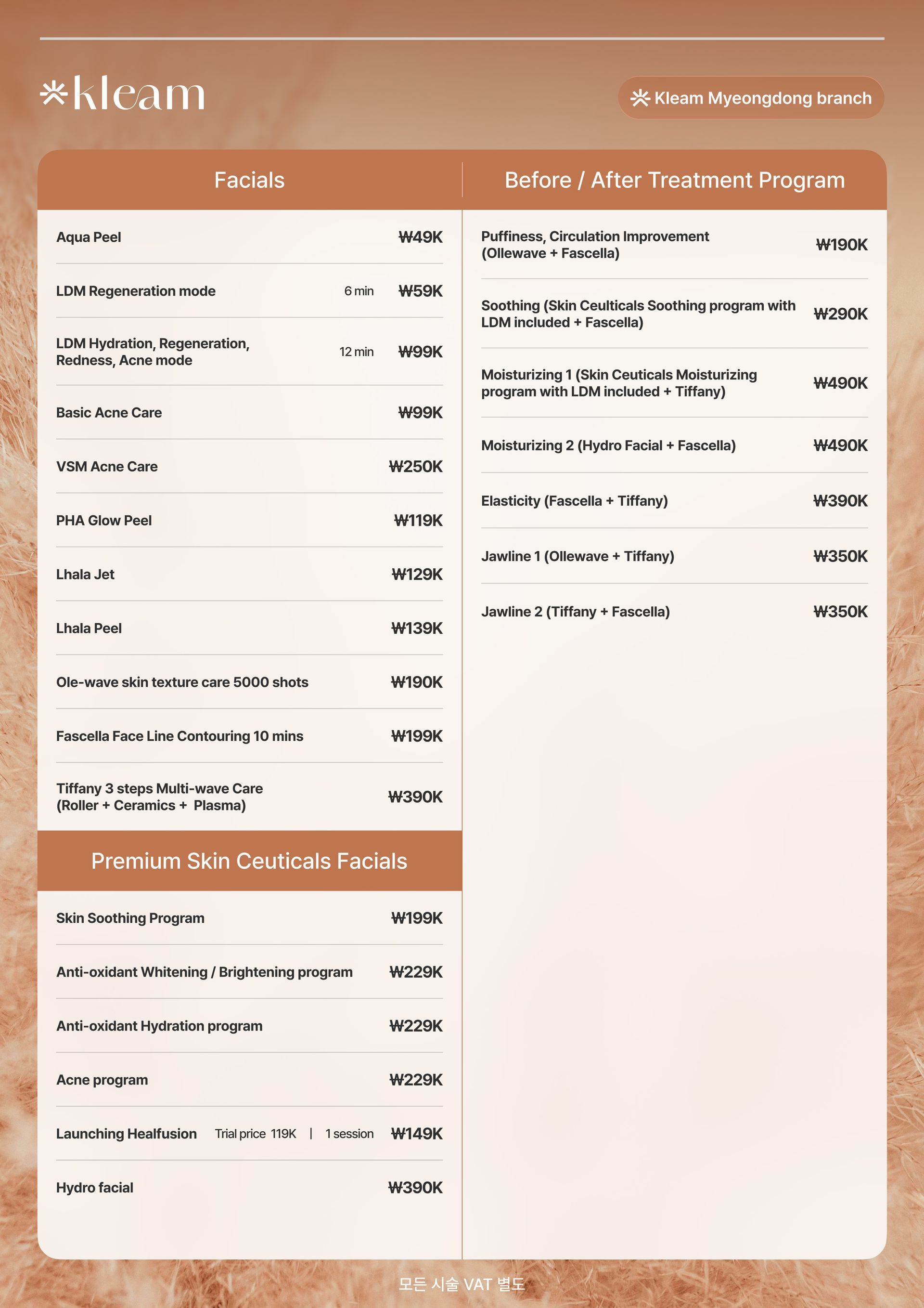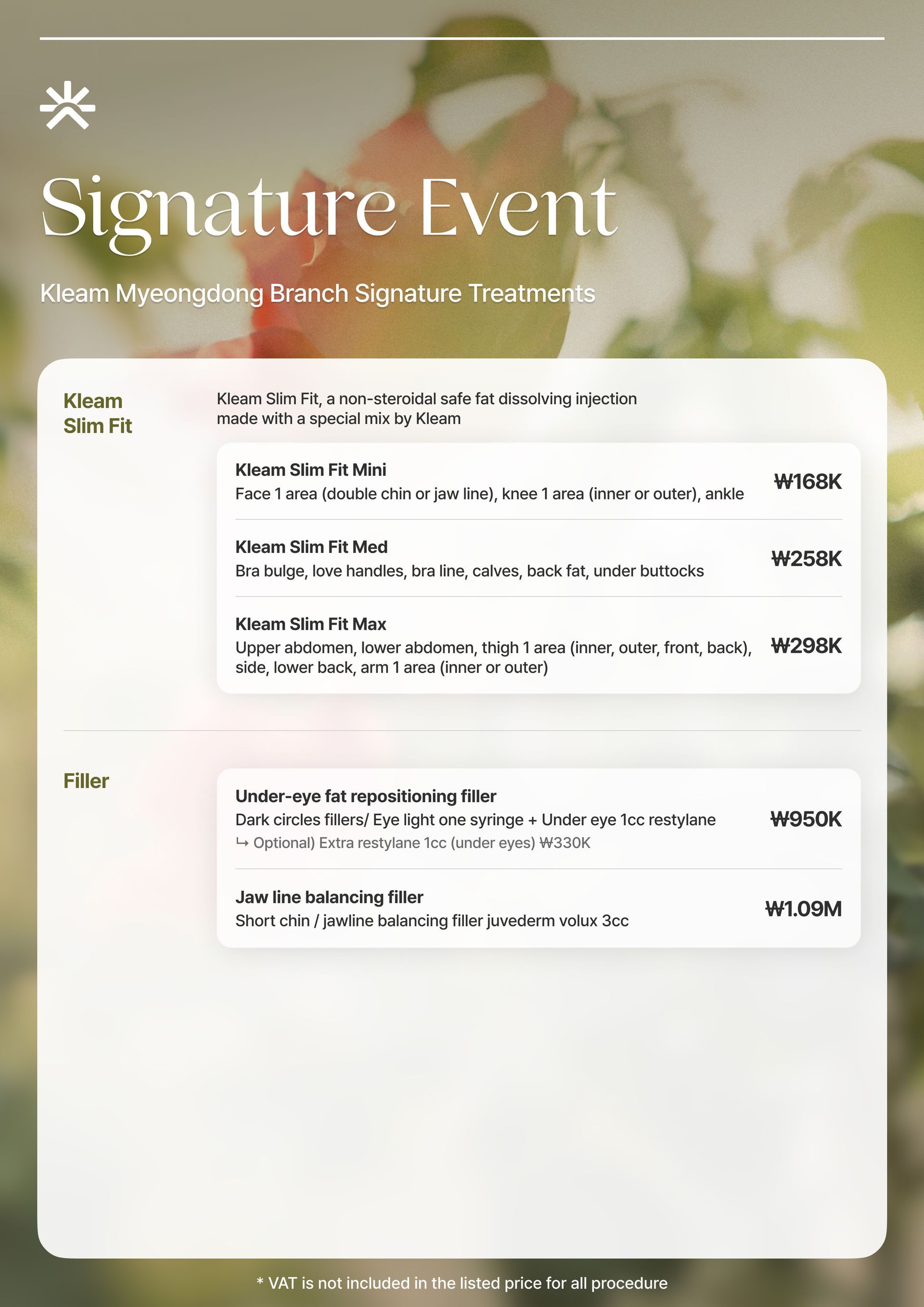 スキンバイブ、ラディエス、ウォーターグロー インジェクション、リジュラン ヒーラー、Qフェイシャル、LDM、ウォータードロップ リフティング ピール、モール DM.セル、スキン プラス アンプル、エクソソーム(G-MPF)、リリード M、ジュヴルック、シャネル インジェクション、アクア シャイン BTX、バイタル インジェクター 2、ダーマシャイン バランス、スキンブースター プロ、シャイニング ピール、オキシジェン ドーム フェイシャル、LED ライト セラピー、カーミング ケア フェイシャル、ハイドレーション インフュージョン セラピー、ブライトニング フェイシャル、皮脂コントロール フェイシャル、毛穴引き締めブースター、モイスチャー グロー ショット、グルタチオン IV、ビタミン C 点滴、アンチエイジング カクテル 点滴、MTS アンプル フェイシャル、グアシャ フェイシャル、高周波フェイシャル、アクネ ピール、エンザイム ピール、ミルク ピール、マンデリ クリア ピール、サーモン DNA ブースター、ポリヌクレオチド セラピー、5GF アンプルセラピー