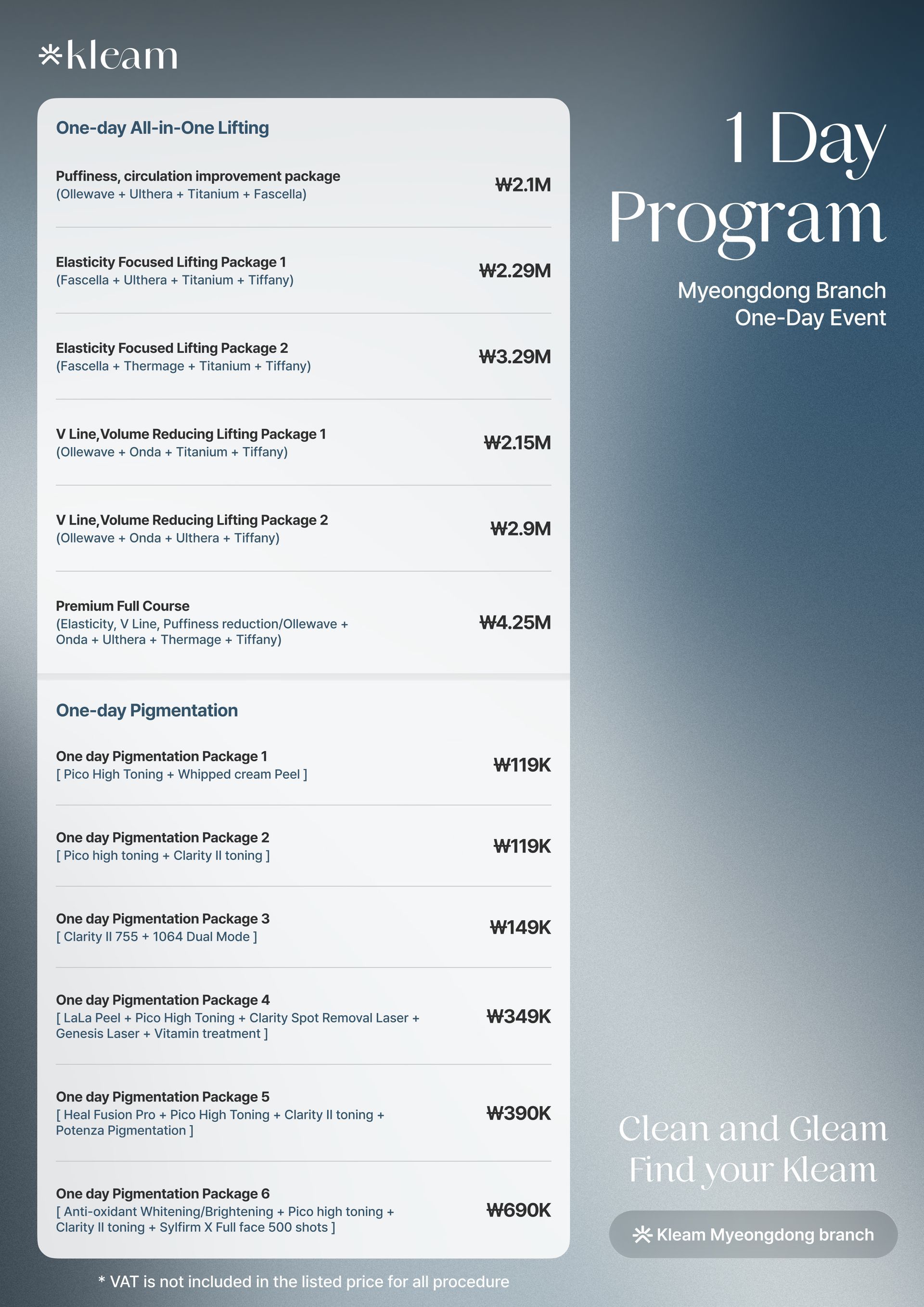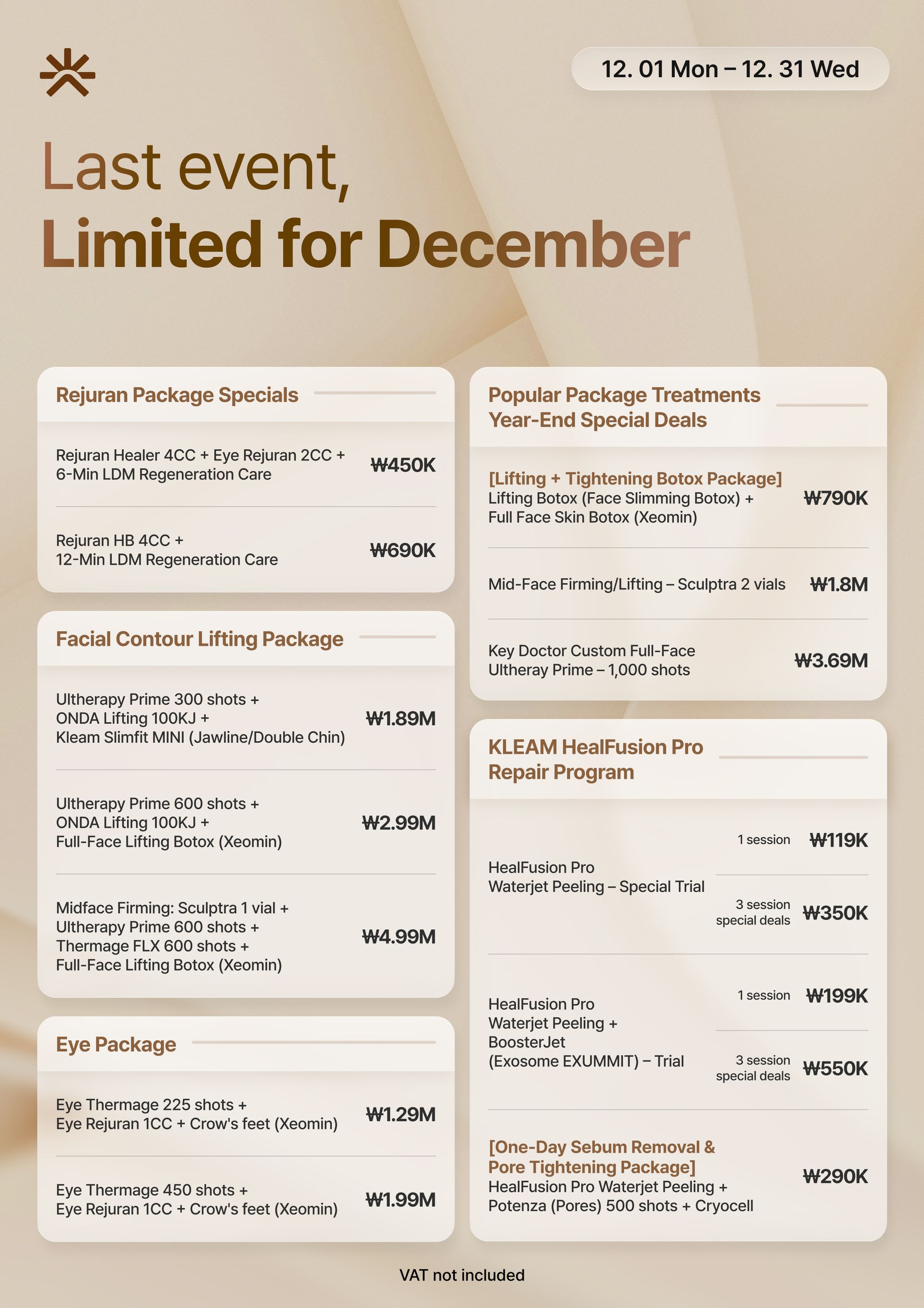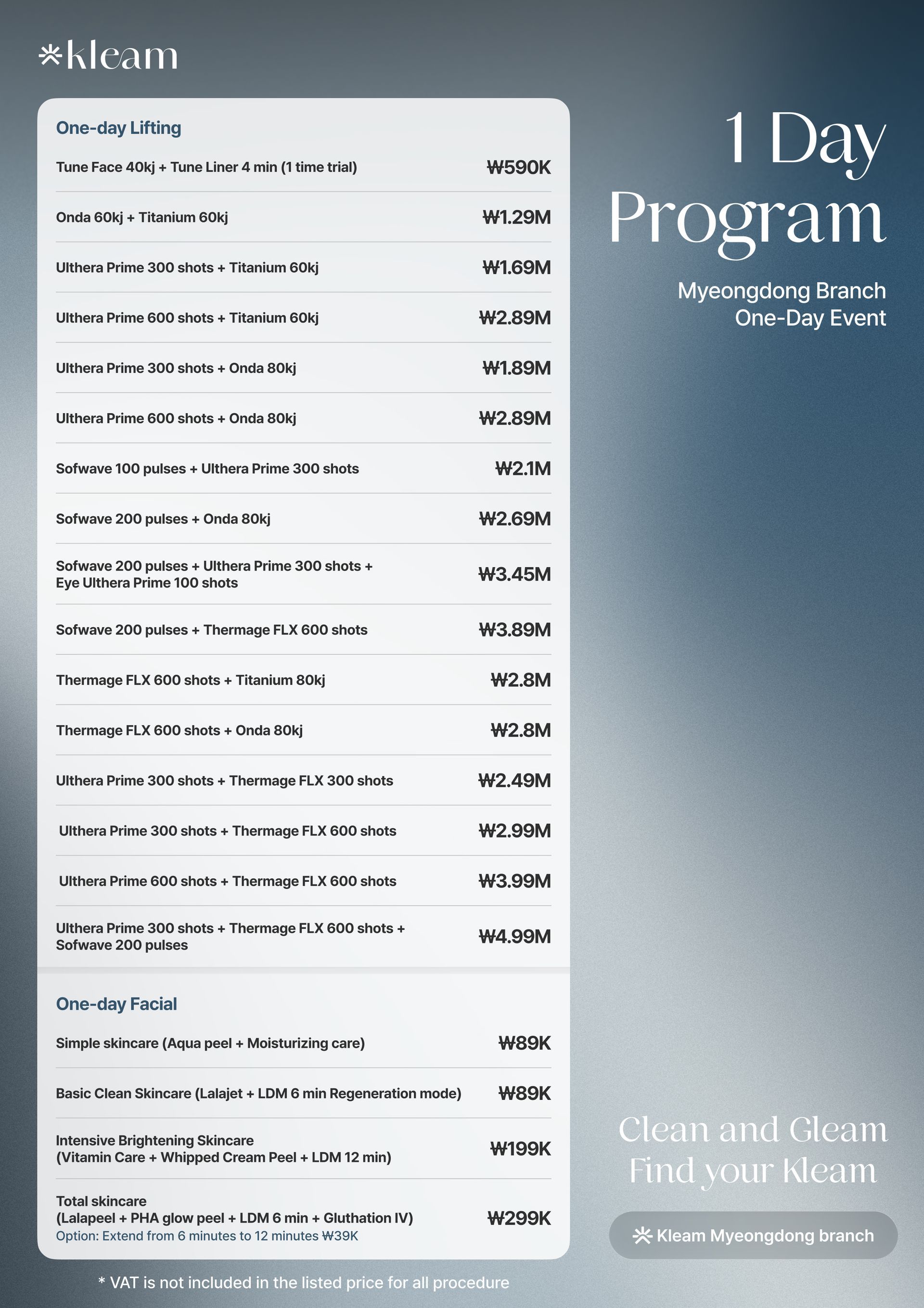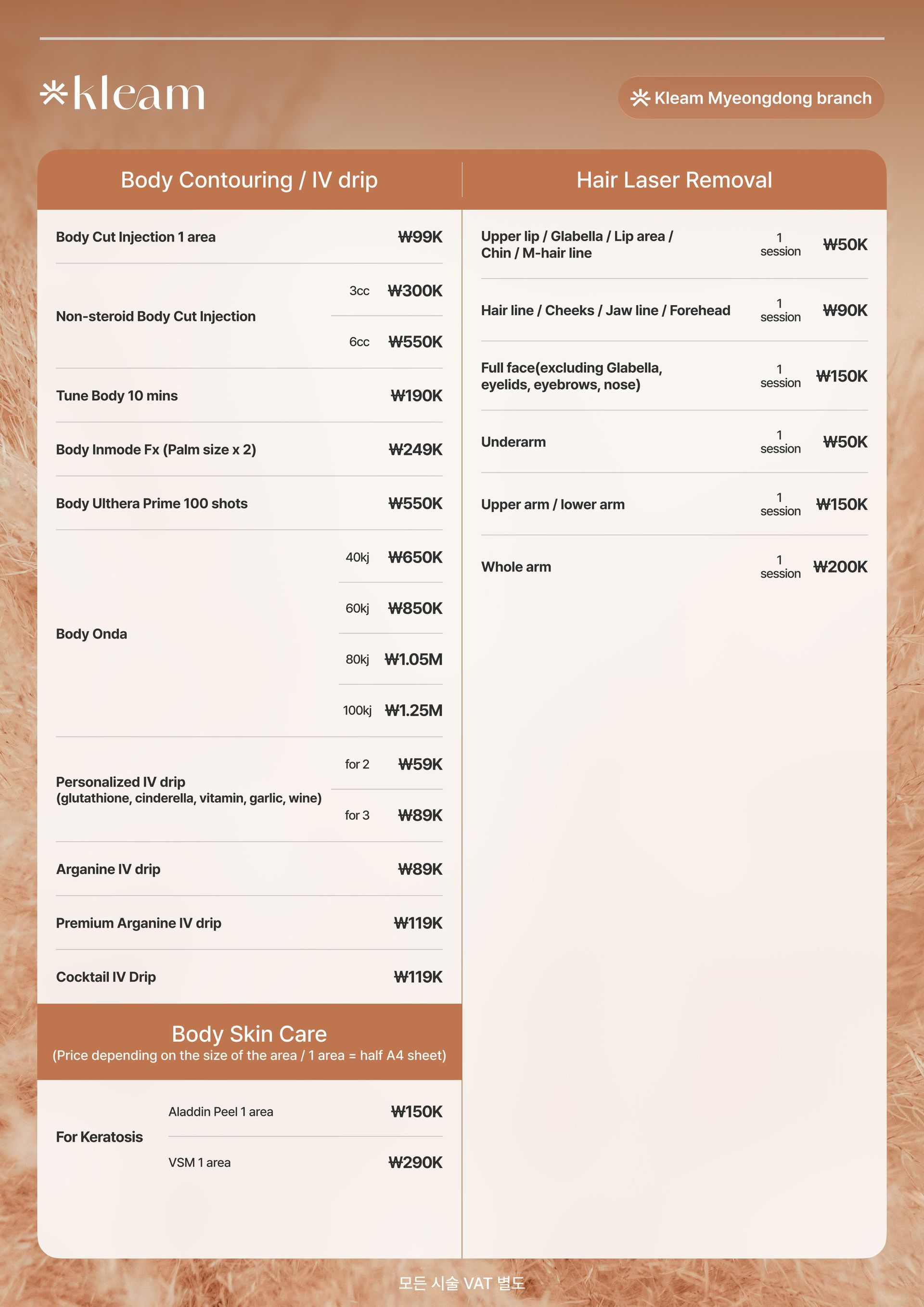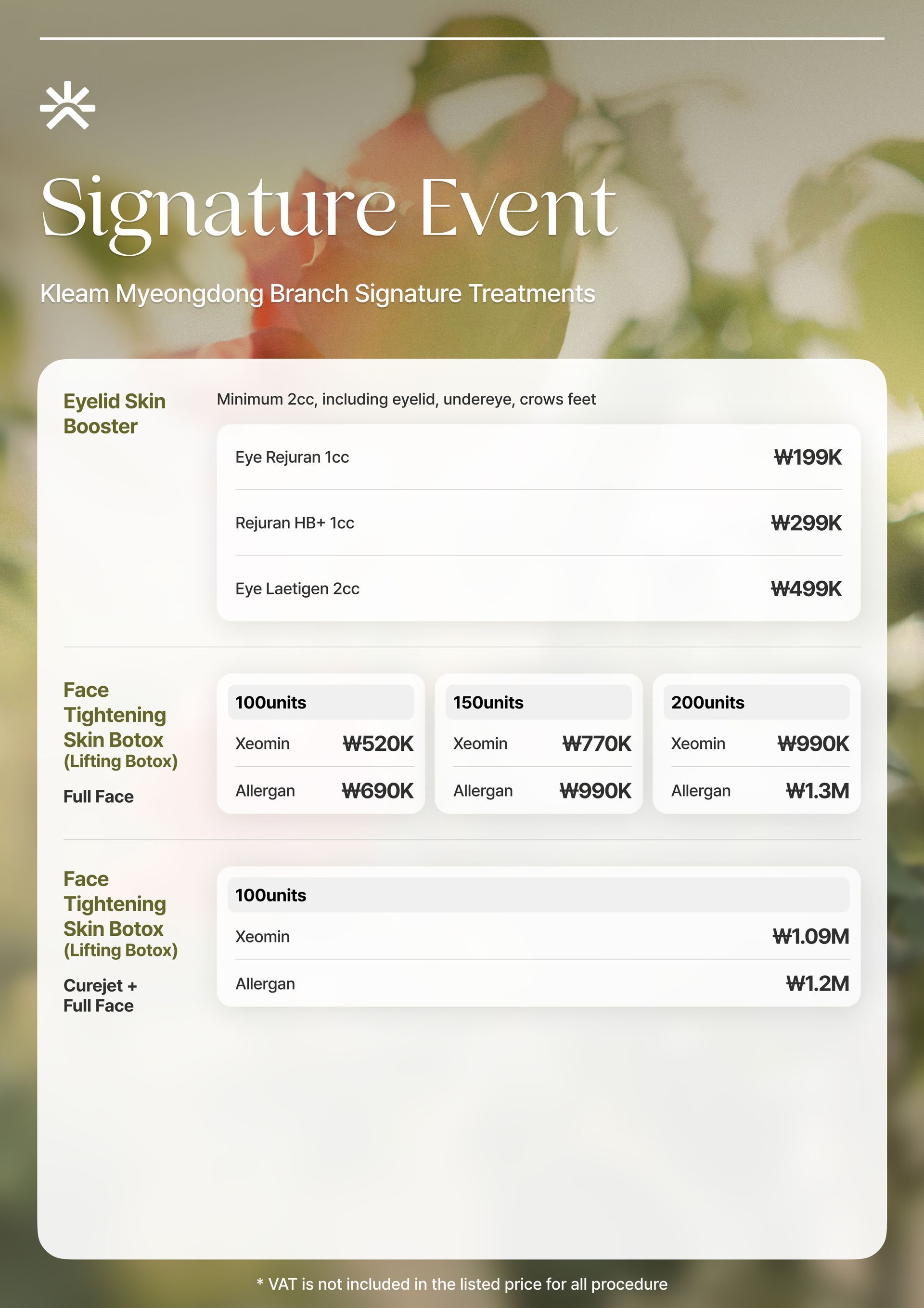 スキンバイブ、ラディエス、ウォーターグロー インジェクション、リジュラン ヒーラー、Qフェイシャル、LDM、ウォータードロップ リフティング ピール、モール DM.セル、スキン プラス アンプル、エクソソーム(G-MPF)、リリード M、ジュヴルック、シャネル インジェクション、アクア シャイン BTX、バイタル インジェクター 2、ダーマシャイン バランス、スキンブースター プロ、シャイニング ピール、オキシジェン ドーム フェイシャル、LED ライト セラピー、カーミング ケア フェイシャル、ハイドレーション インフュージョン セラピー、ブライトニング フェイシャル、皮脂コントロール フェイシャル、毛穴引き締めブースター、モイスチャー グロー ショット、グルタチオン IV、ビタミン C 点滴、アンチエイジング カクテル 点滴、MTS アンプル フェイシャル、グアシャ フェイシャル、高周波フェイシャル、アクネ ピール、エンザイム ピール、ミルク ピール、マンデリ クリア ピール、サーモン DNA ブースター、ポリヌクレオチド セラピー、5GF アンプルセラピー